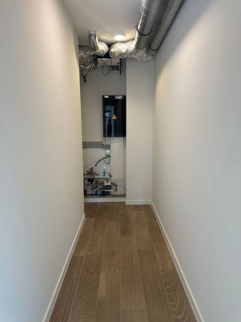 Le hall central dessert toutes les autres pièces de l’appartement. En plus des deux chambres complètes, il y a des toilettes séparées et une salle de bains équipée à la fois d’une baignoire et d’une douche. Ici aussi, le confort est associé à des choix de matériaux attrayants et à des finitions soignées telles que l’éclairage indirect.