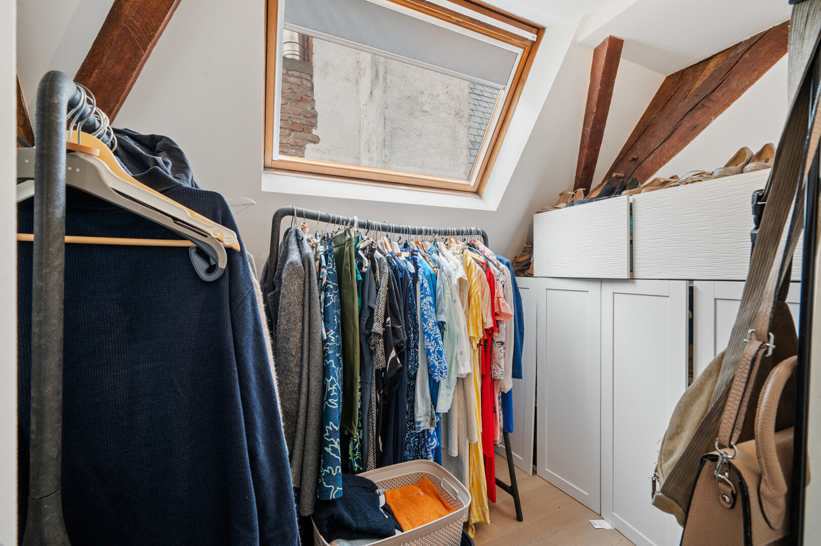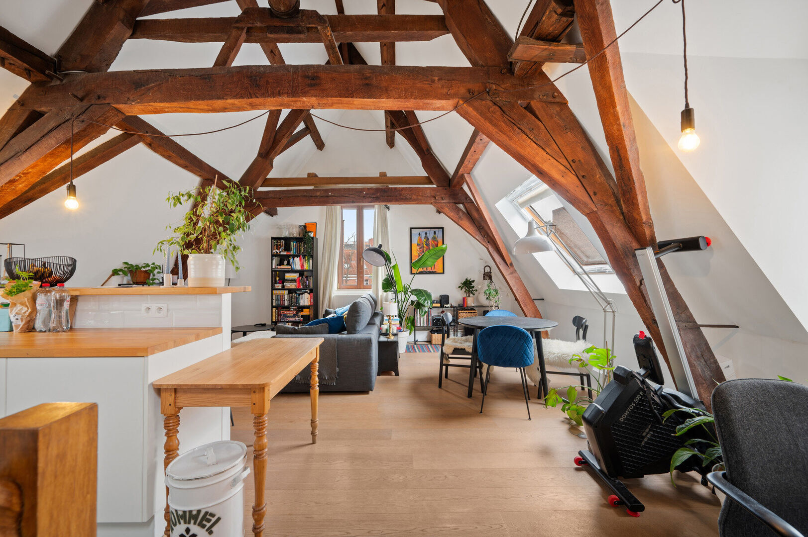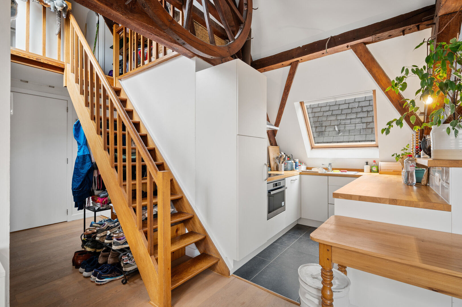 L'appartement comprend une entrée, une petite chambre, une salle de bains avec douche dans la baignoire et un vaste espace de vie ouvert avec une charpente apparente et une cuisine ouverte. Sous le toit en pente, vous trouverez une autre pièce confortable, idéale comme chambre à coucher.