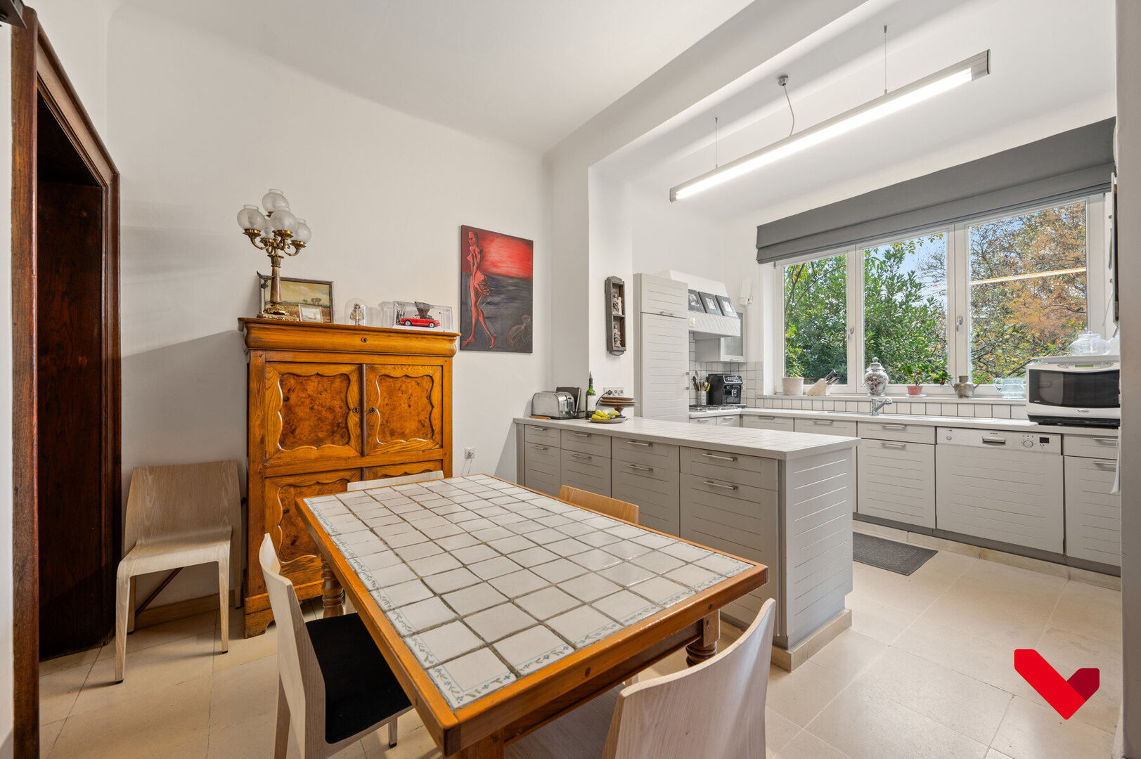 Le hall d’entrée constitue le centre majestueux de la maison et en répartit harmonieusement les espaces. D’un côté se trouve le vaste séjour plein de caractère, avec parquet, grandes fenêtres et finitions classiques qui renforcent le charme de la maison. De l’autre côté, vous trouverez la grande cuisine avec vue sur le jardin ainsi qu’un second espace de vie, idéal comme salon supplémentaire, bureau ou pièce polyvalente. Chaque pièce possède son propre caractère et sa fonctionnalité, tout en s’intégrant parfaitement dans l’ensemble élégant de la maison.