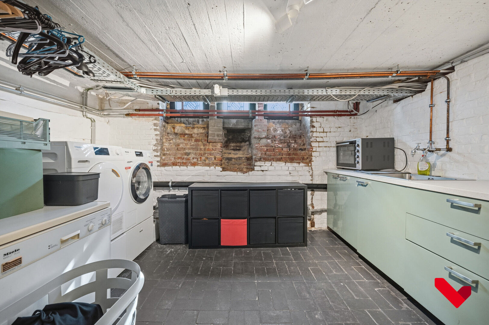 • Cave particulièrement fonctionnelle, utilisée comme buanderie et espace de rangement à part entière