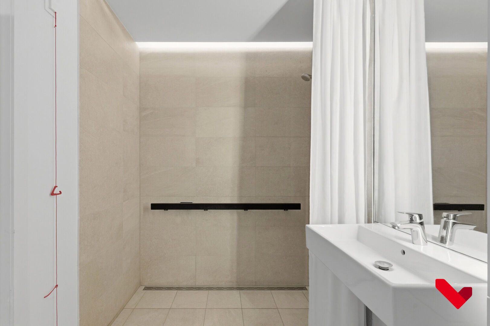 L’appartement dispose en outre d’une chambre spacieuse et d’une salle de bains équipée d’une douche accessible en fauteuil roulant, de toilettes, d’un lavabo ainsi que de barres d’appui et de soutien. Enfin, vous trouverez également un espace de rangement pratique avec les raccordements pour une machine à laver et un sèche-linge.