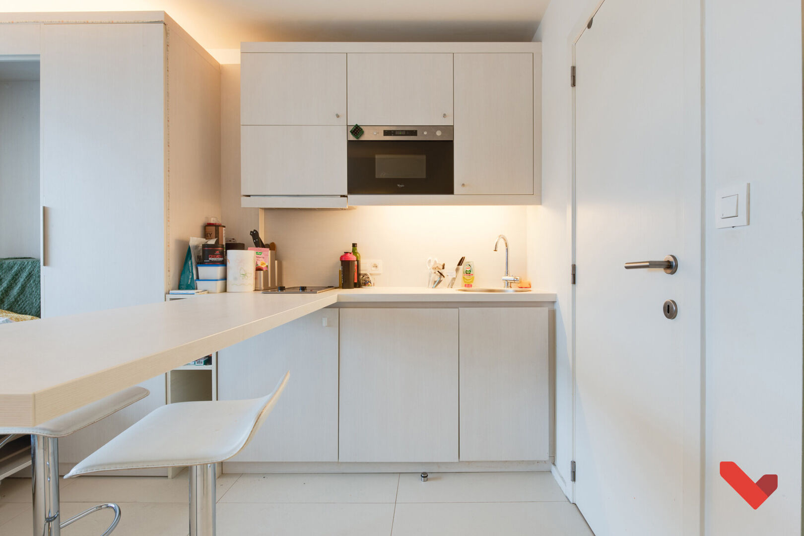 Ce grand studio dispose d’une kitchenette équipée, de sanitaires privatifs et d’un meuble intégré avec lit escamotable. Grâce aux grandes baies vitrées, vous bénéficiez également d’une agréable lumière naturelle.