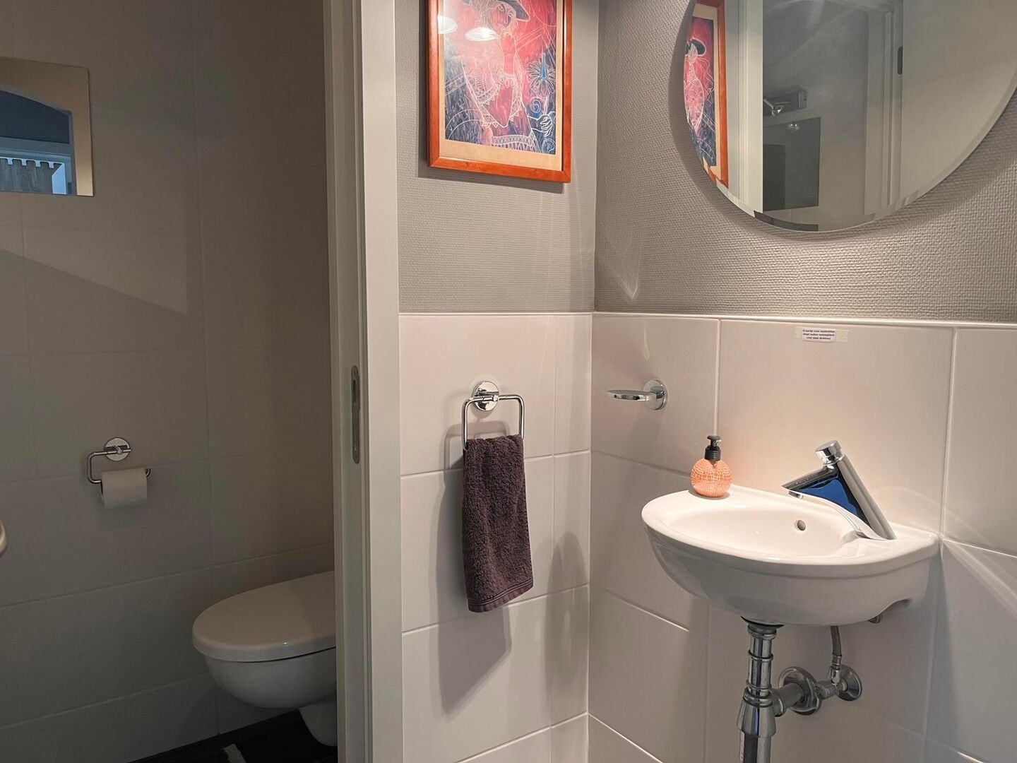 Achteraan vind je de badkamer met dubbele lavabo en douche-in-bad, een zeer ruime slaapkamer van ca. 20 m² met eigen terras en een tweede volwaardige slaapkamer.