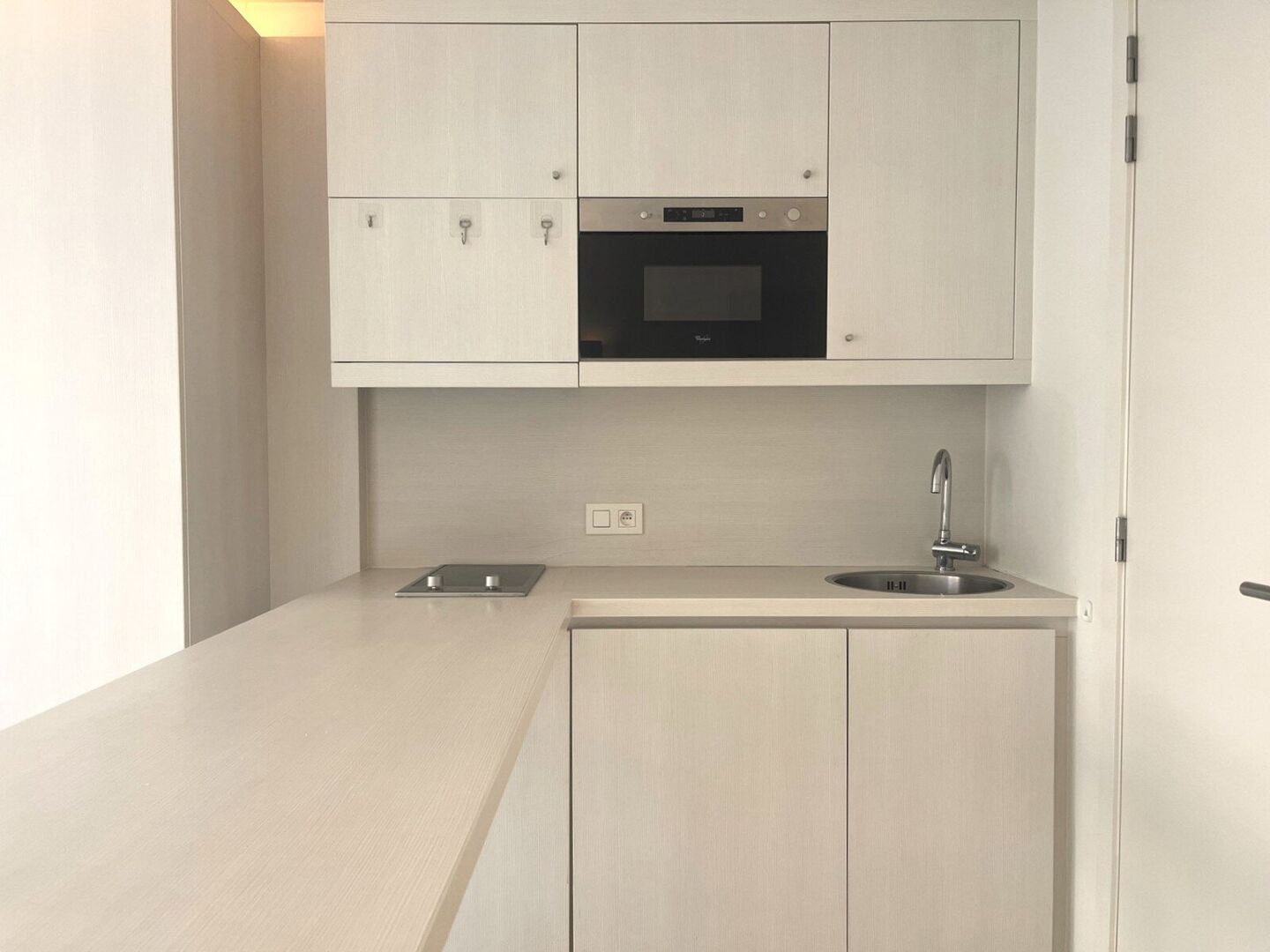 Deze ruime studio beschikt over een geïnstalleerde kitchenette, eigen sanitair en een geïnstalleerd meubel met opklapbaarbed.