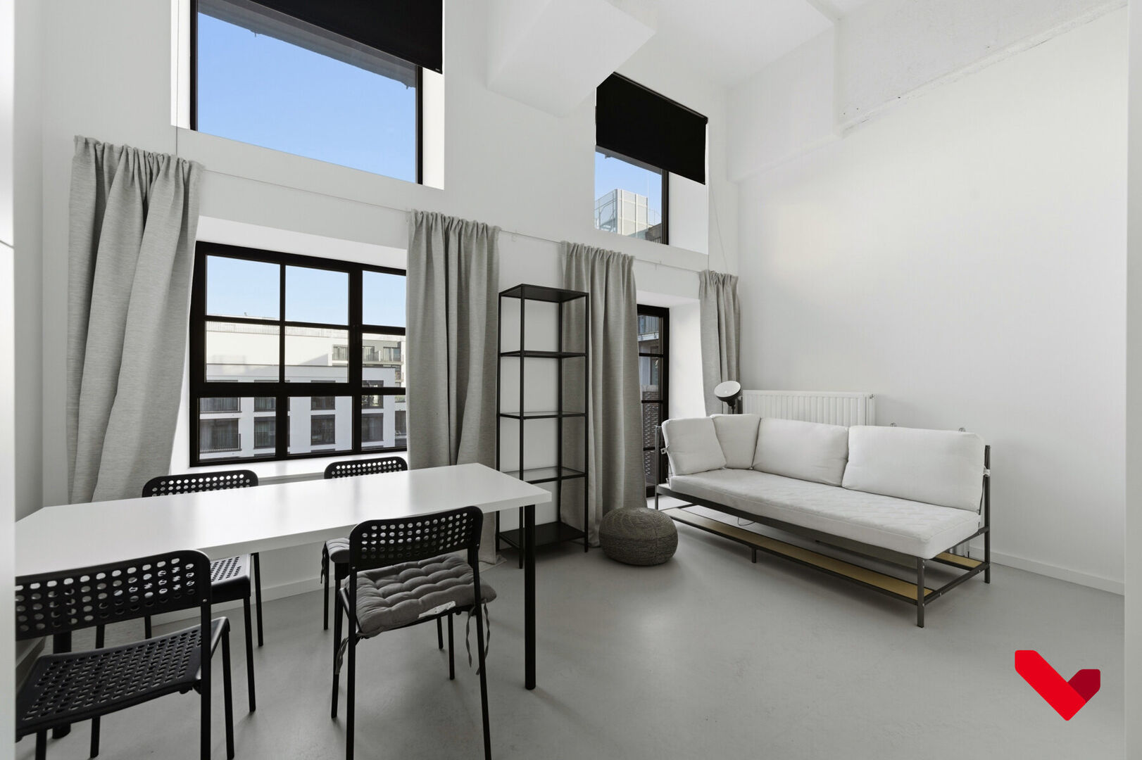 De studio wordt gekenmerkt door ongeziene plafondhoogtes tot 4,5 meter die toestaan het slaapgedeelte in de hoogte te plaatsen. In combinatie met de voorziening van een duurzaam conceptmeubel worden de ruimtes optimaal benut. De hoge plafonds zorgen daarbovenop samen met de grote ramen voor een fantastische lichtinval. De studio staat kortom voor maximale ruimteoptimalisatie, gericht op comfort, luxe en rust. Indeling: leefruimte, open geïnstalleerde keuken, slaapruimte op verdiep, badkamer met lavabo, toilet en een aansluiting voor een wasmachine.