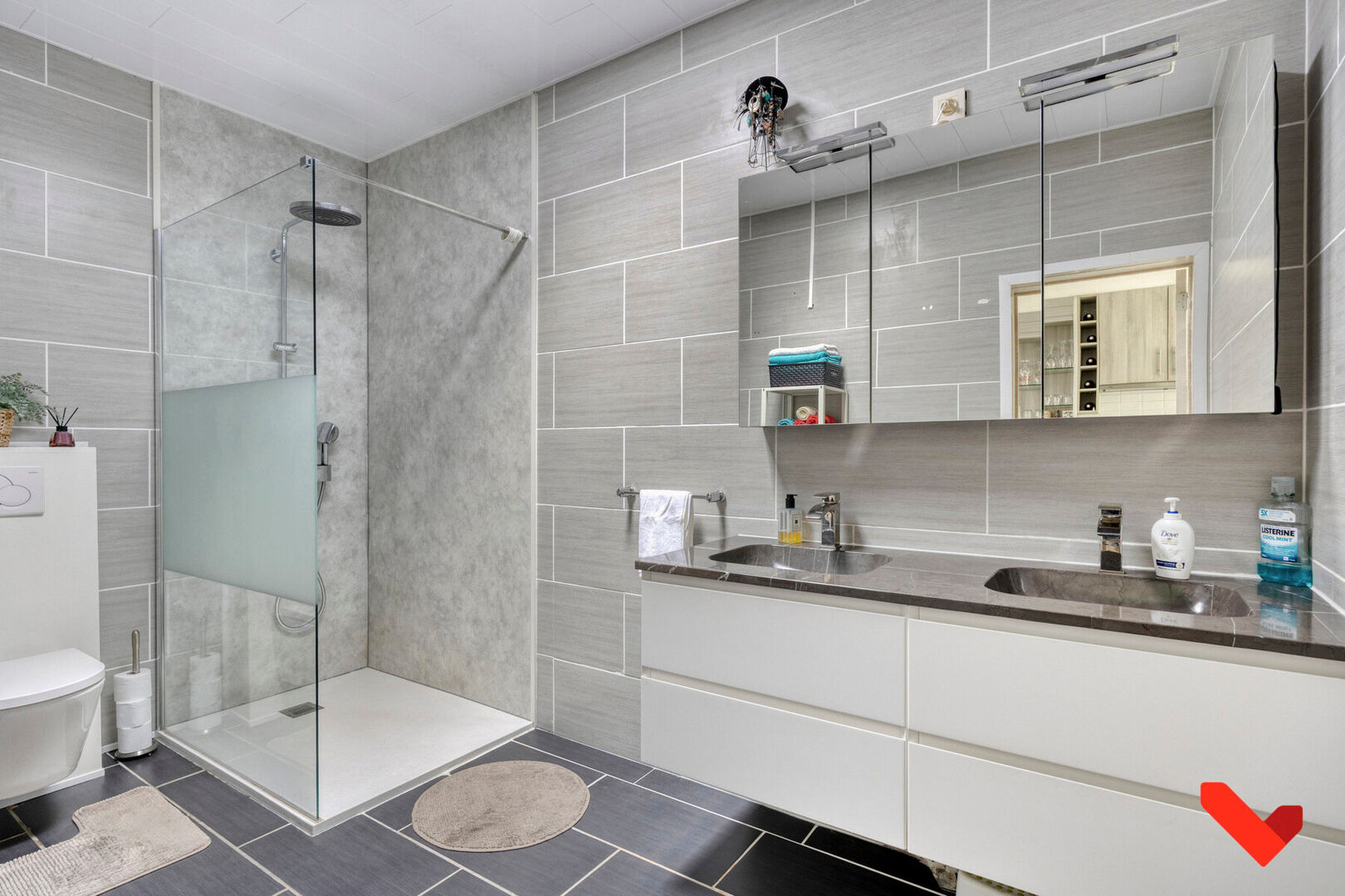 Naast de leefruimte bevindt zich de volledig vernieuwde badkamer met inloopdouche, dubbele lavabo en toilet.