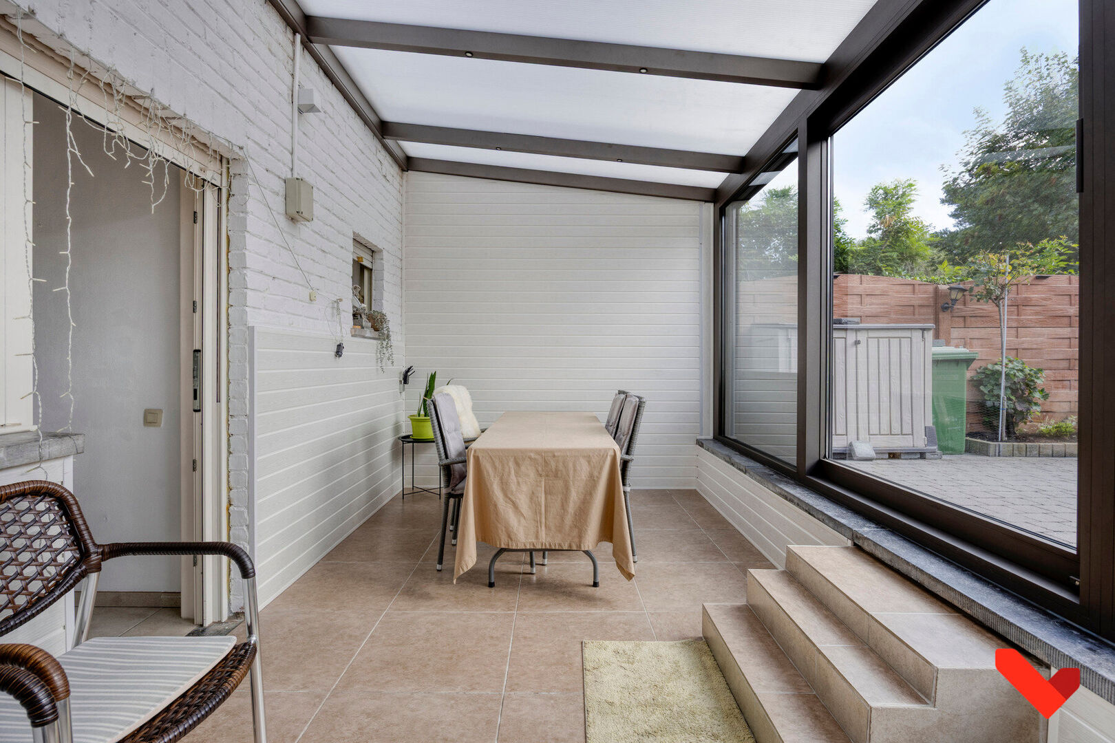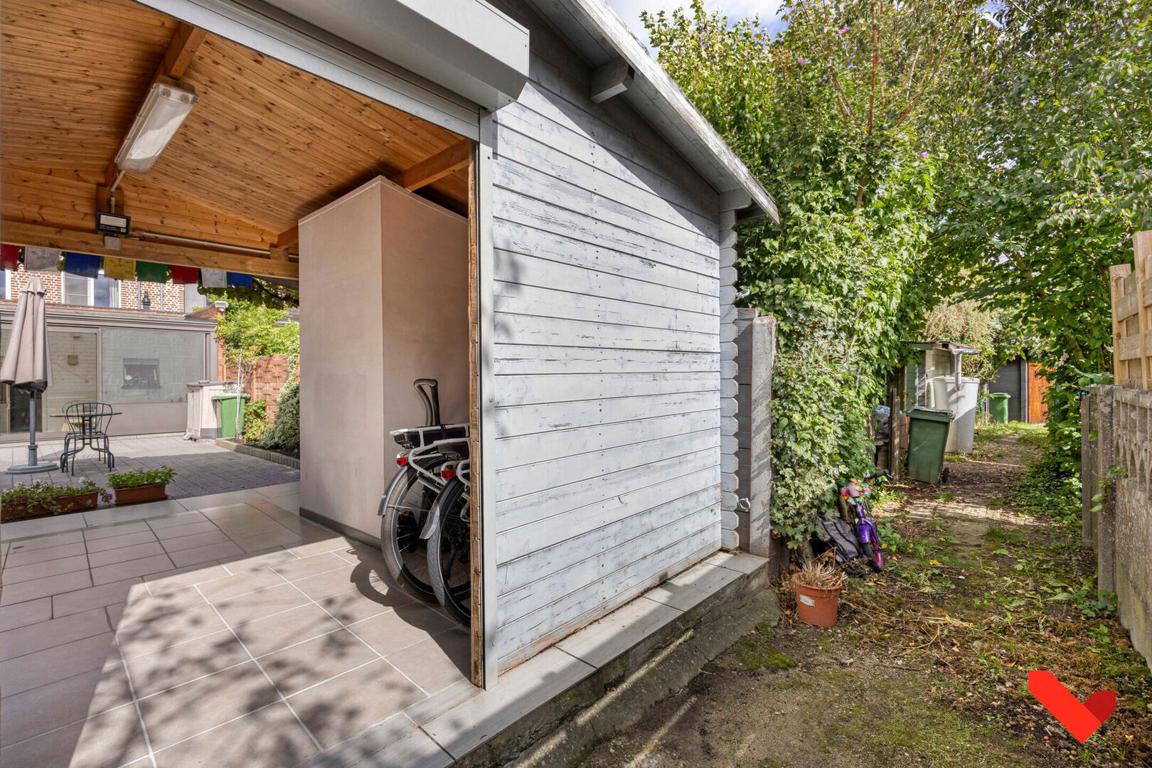 De tuin is de perfecte plek om te genieten van het buitenleven of om te barbecueën met vrienden en familie. Ook als het weer iets minder is kan je schuilen onder het open tuinhuis met lounge-gedeelte en apart toilet. Ook in de veranda is het leuk vertoeven moesten de weergoden wat minder goed gezind zijn of om in de winter te genieten van het zonnetje. Het is een rustige en groene omgeving waar kinderen veilig kunnen spelen in de speeltuin om de hoek.