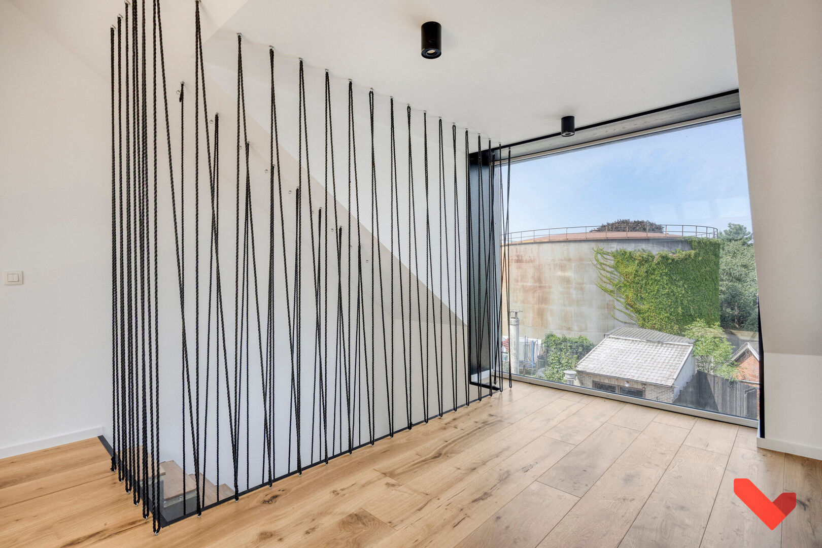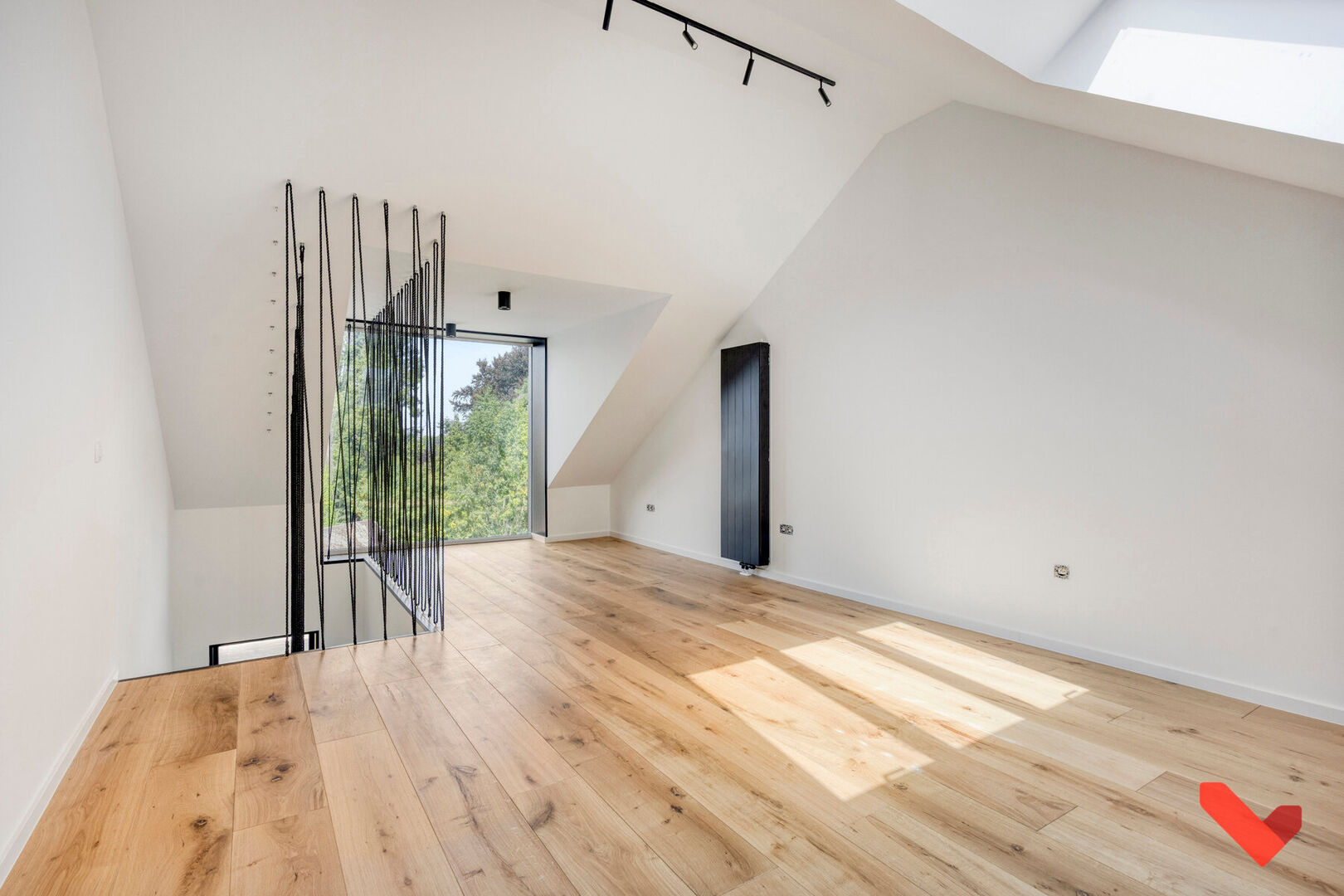 Op de eerste verdieping bevinden zich twee slaapkamers en een moderne badkamer met inloopdouche, uitgevoerd in hedendaagse materialen en stijlvolle afwerking. De zolderverdieping werd ingericht als derde slaapkamer met een grote dakkapel die zorgt voor veel licht en een aangename sfeer. De woning beschikt bovendien over een kelder, perfect voor extra bergruimte.