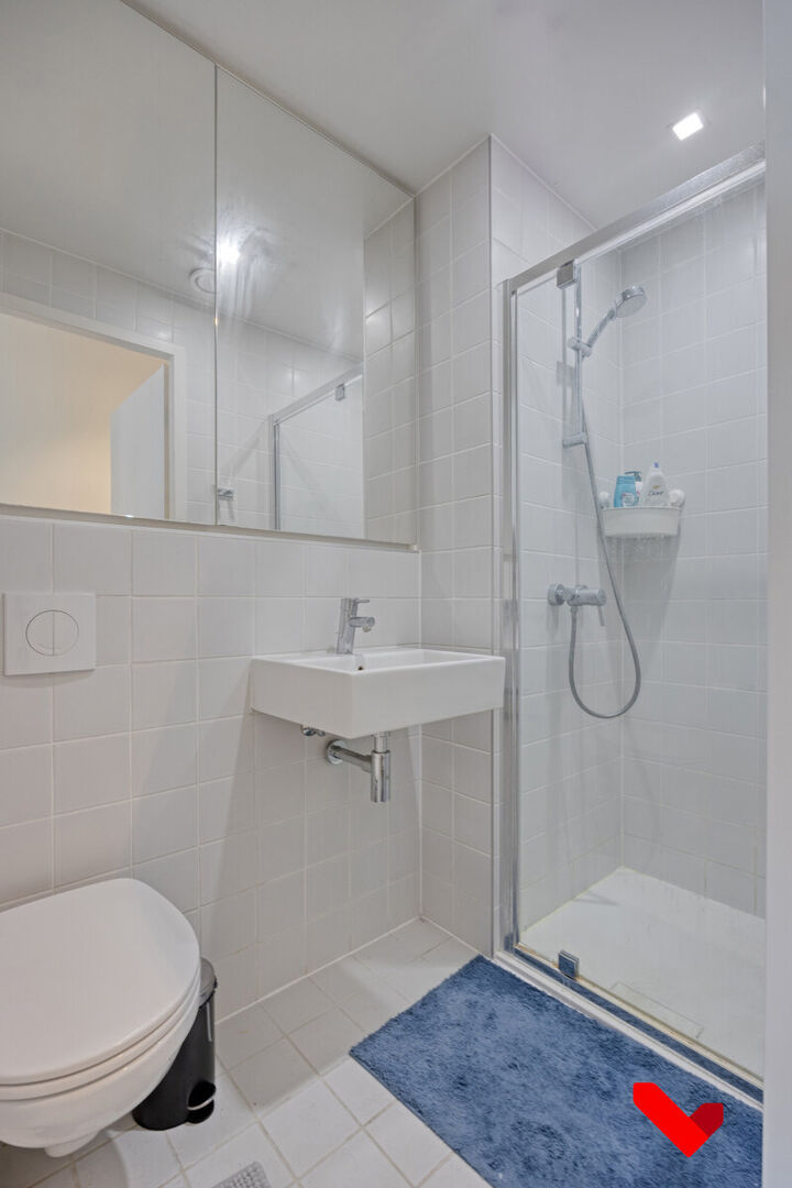 De kamer beschikt over een eigen badkamer met toilet en douche en is slim ingericht met een vast meubel dat voldoende kastruimte biedt, evenals een eigen koelkast.